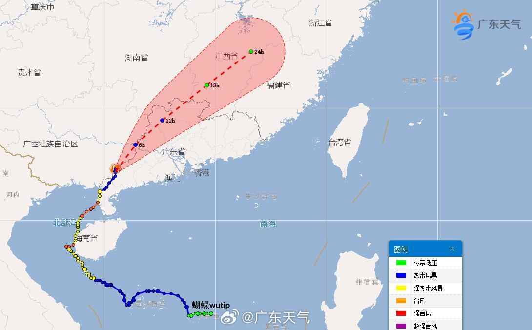 继13日夜间23时前后登陆海南后,14日中午“蝴蝶”又在广东雷州西部沿海二次登陆,登陆时强度为强热带风暴级。14日21时,台风“蝴蝶”的中心位于广西壮族自治区北流市境内,强度为热带风暴级。