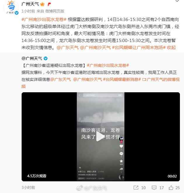 经广州市气象局工作人员核实,14日14:36-15:30之间有2个自西南向东北移动的超级单体,经过虎门大桥南侧及南沙龙穴岛东侧并进入东莞市虎门镇,另外根据网友拍摄视频时间和角度,最大可能情况是:虎门大桥南侧水龙卷发生时间在14:36-15:00之间,龙穴岛东侧水龙卷发生时间是15:00-15:30之间。