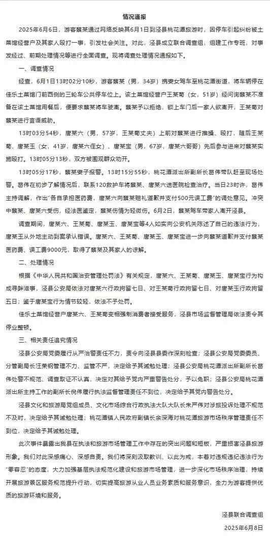 6月8日,安徽泾县联合调查组通报,2025年6月6日,游客蔡某通过网络反映其6月1日到泾县桃花潭旅游时,因停车引起纠纷被土菜馆经营户及其家人殴打一事,引发社会关注。目前涉事3人被行拘,5名公职人员被追责,涉事菜馆被停业整顿。(据6月8日新京报报道)