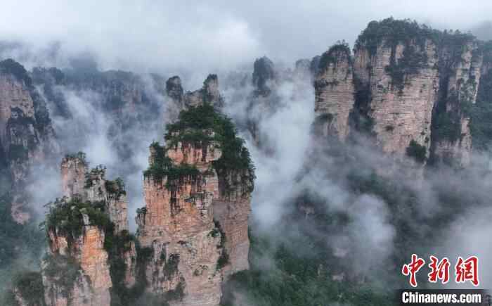 6月8日,湖南张家界国家森林公园百龙天梯、十里画廊出现雨后云海胜景,云雾在峰林间变幻飘逸,宛如水墨画境。吴勇兵 摄