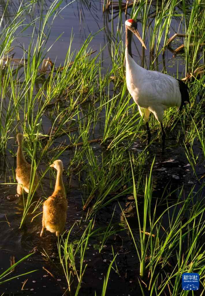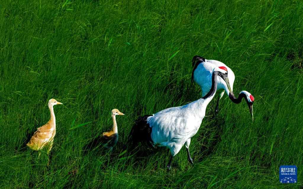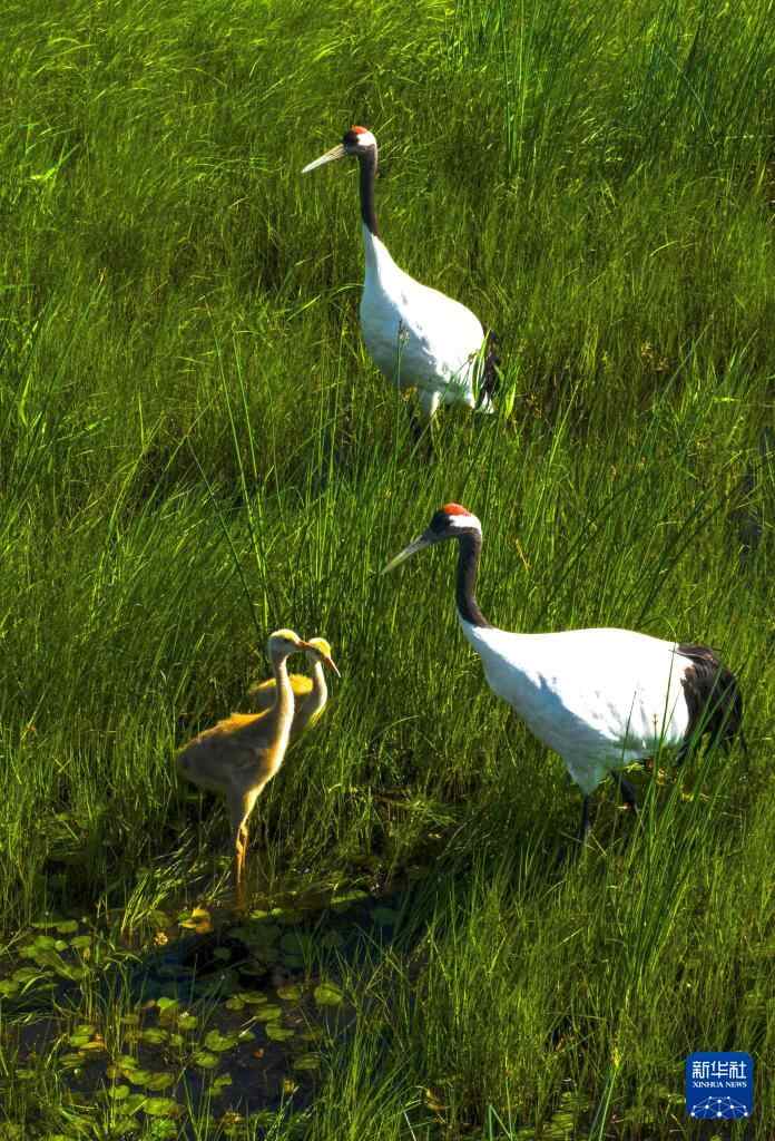 黑龙江挠力河国家级自然保护区位于三江平原腹地,地跨宝清、富锦、饶河、抚远三县一市。时下,在保护区湿地内,野生丹顶鹤正忙着“带娃”,自然繁殖的鹤宝宝紧随着爸爸妈妈漫步觅食,其乐融融。