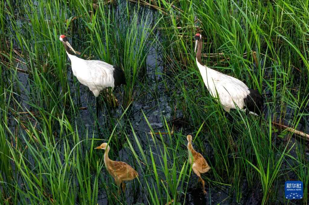 6月7日,在黑龙江挠力河国家级自然保护区湿地,两只鹤“宝宝”跟随亲鸟觅食(无人机照片)。