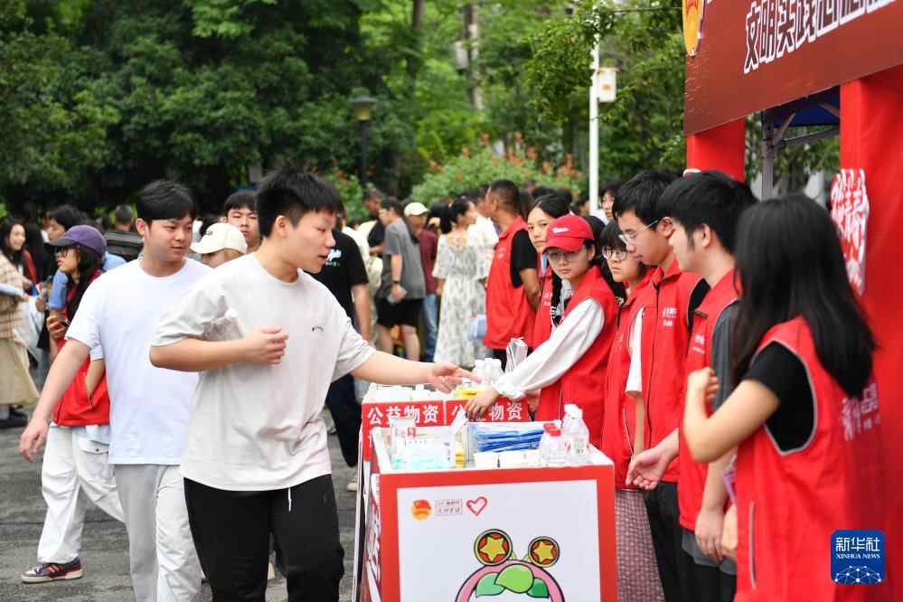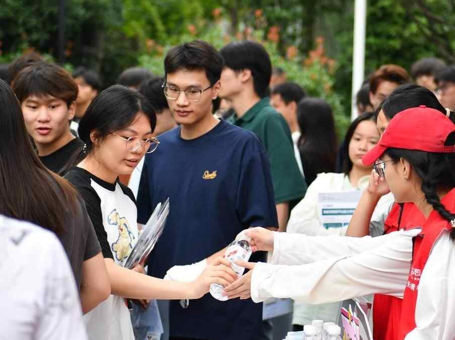 6月8日,志愿者在湖南省天心考区长郡湘府中学考点为考生提供饮用水。