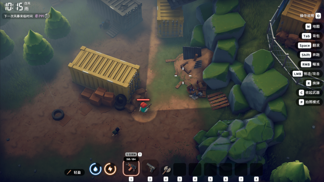 其二,它的射击方式相对简单,跟随着鼠标位置按左键指哪儿打哪个方向,而如Shift加速跑、右键瞄准(相对精准)、R换弹、tab背包、M地图等涉及移动/战斗的相关操作,也几乎是所有射击游戏的通用设定,能快速上手。
