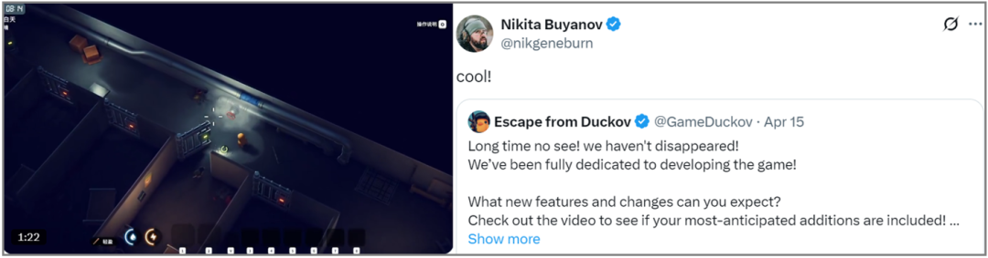 从名字上很容易看出它想借“搜打撤鼻祖”塔科夫的“势”博个曝光度,神奇的是“正主”不但不生气,甚至还主动帮它宣传——大概1个多月前,塔科夫制作人Nikita Buyanov在推特上转发了《逃离鸭科夫》的更新演示,直言很CooL。