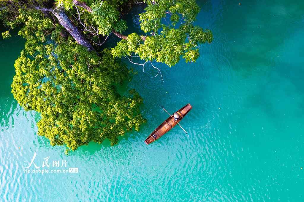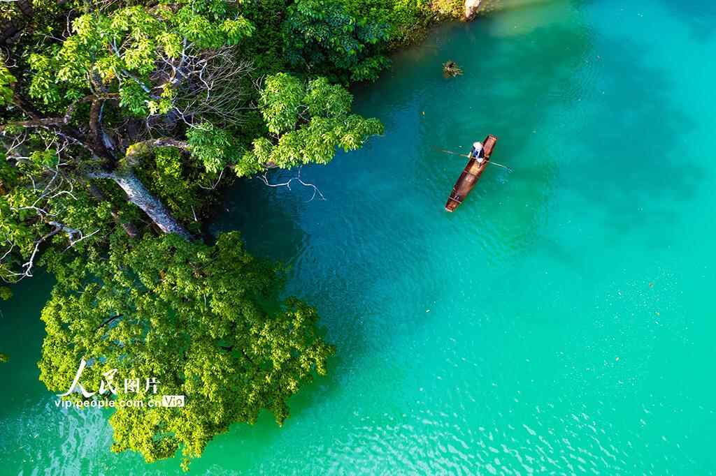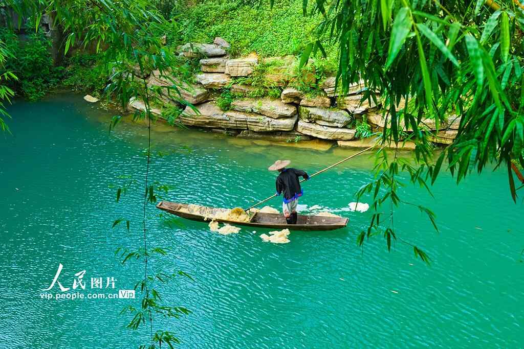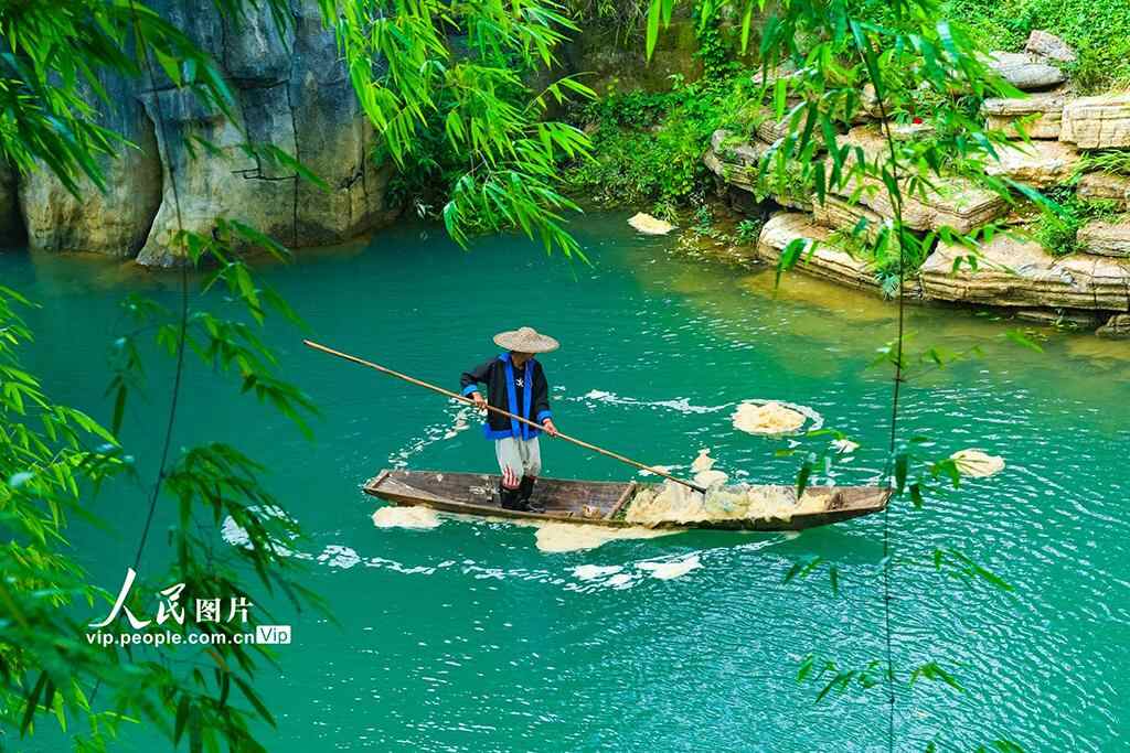 2025年6月7日,在贵州省黔南布依族苗族自治州荔波县的小七孔景区内,工作人员正在清理响水河的漂浮物,美化河道环境。刘一江摄(人民图片网)