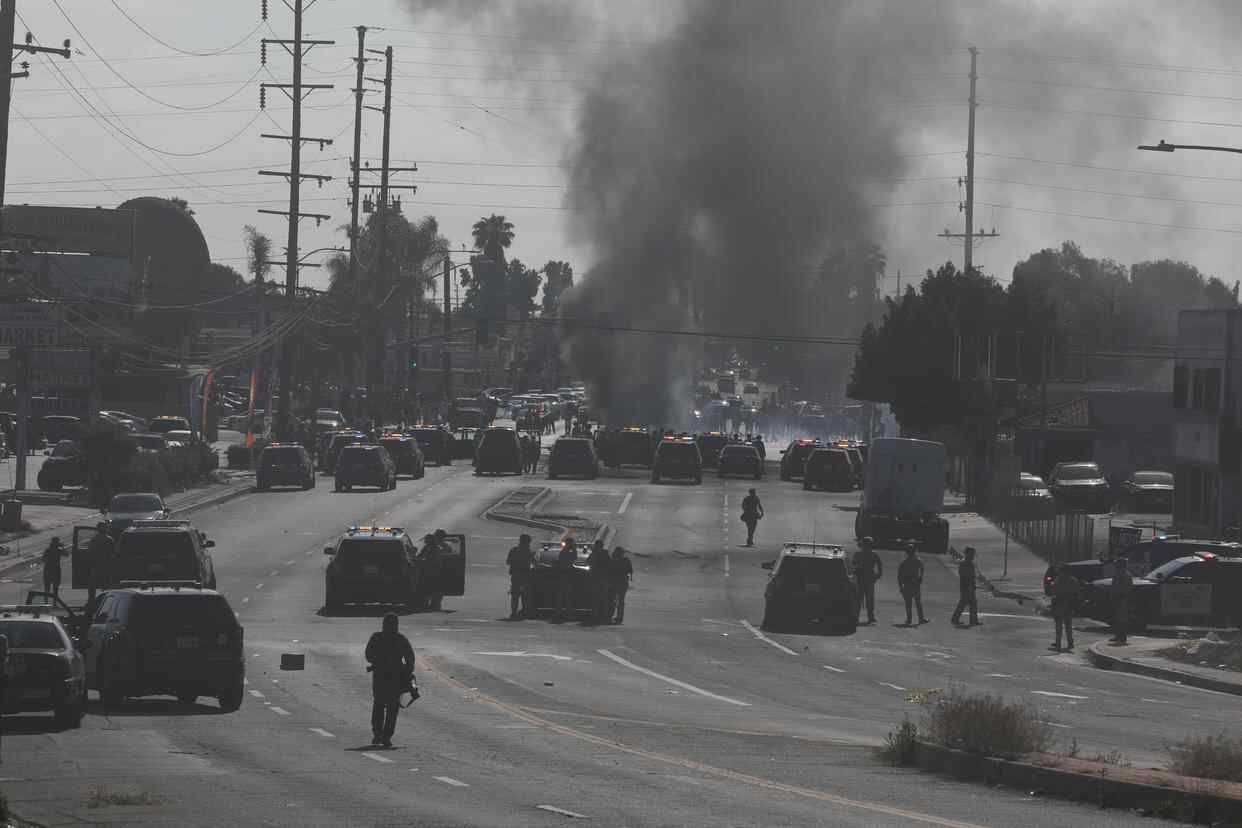 6月7日,在美国加州洛杉矶县,示威民众与警方对峙现场冒出浓烟。新华社发(邱晨摄) 纽森自7日起一直公开表示反对特朗普的决定。美国法律专家说,这是自1965年以来,美国总统首次在未有州长请求的情况下调动州国民警卫队。