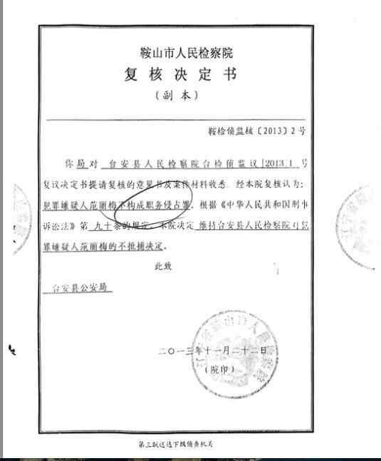 2012年11月28日,台安县检察院经审查认为,范丽梅涉嫌职务侵占罪事实不清、证据不足,决定不予批准逮捕。同日,范丽梅被取保候审。