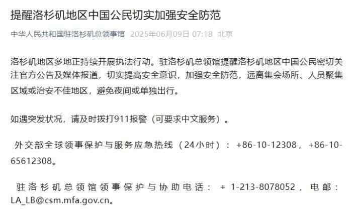 据中国驻洛杉矶总领事馆公众号9日消息,洛杉矶地区多地正持续开展执法行动。驻洛杉矶总领馆提醒洛杉矶地区中国公民密切关注官方公告及媒体报道,切实提高安全意识,加强安全防范,远离集会场所、人员聚集区域或治安不佳地区,避免夜间或单独出行。