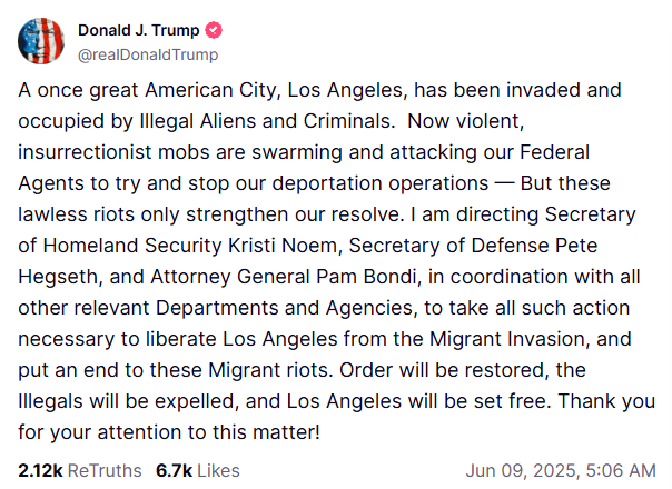特朗普指示国土安全部长诺姆、国防部长赫格塞思和司法部长邦迪等官员,协同相关部门与机构采取一切必要行动,“将洛杉矶从移民入侵中解放出来,并结束这些移民暴乱”。
