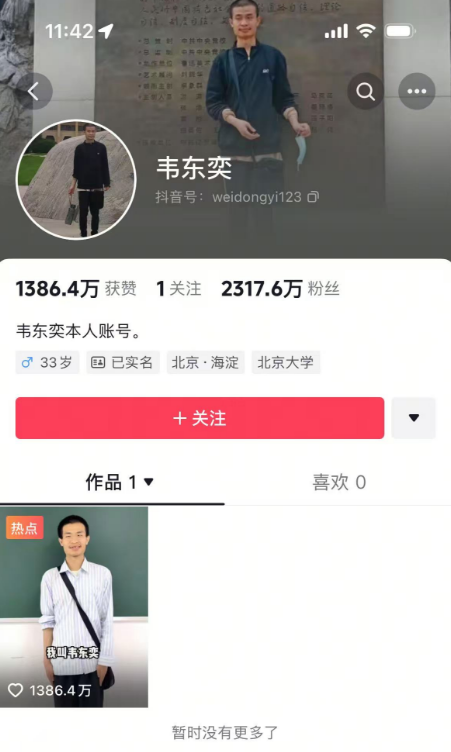 截至6月9日11时42分许,韦东奕账号粉丝已突破2317万。