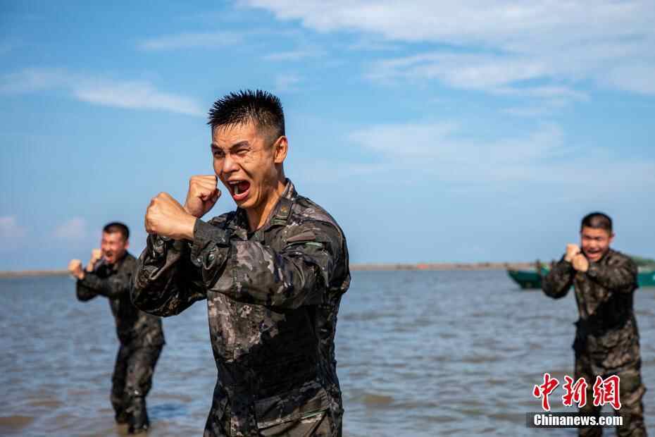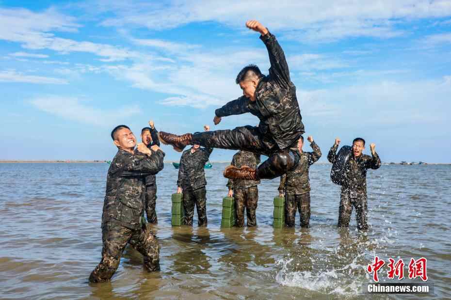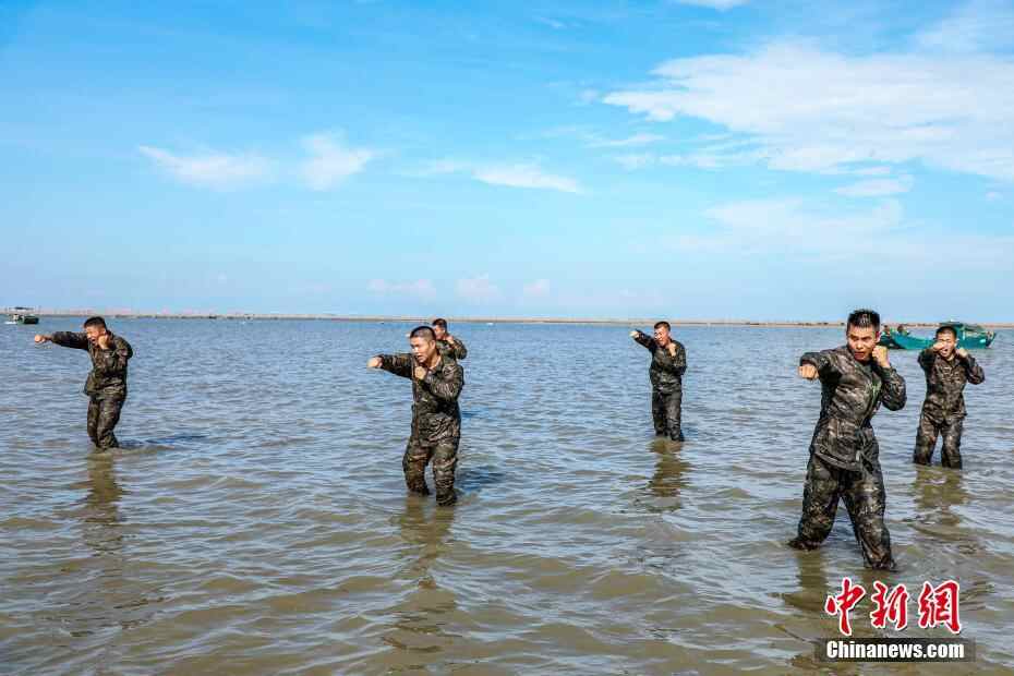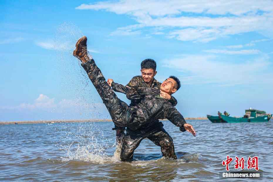 图为武警官兵在海水中进行擒敌拳训练。