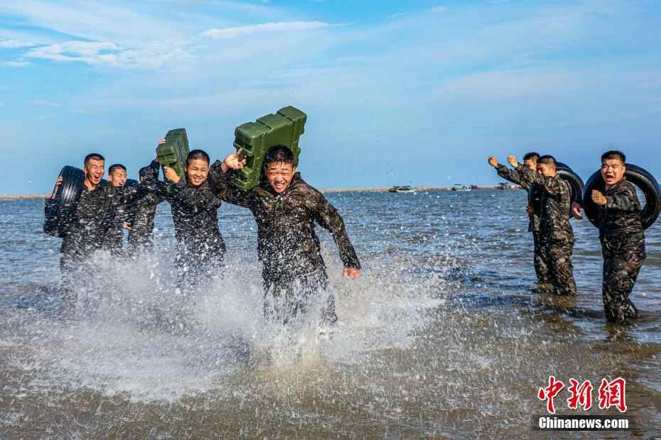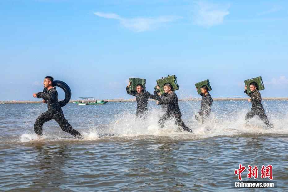 图为武警官兵在海水中进行负重冲刺训练。