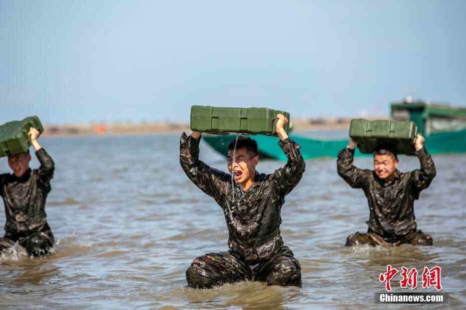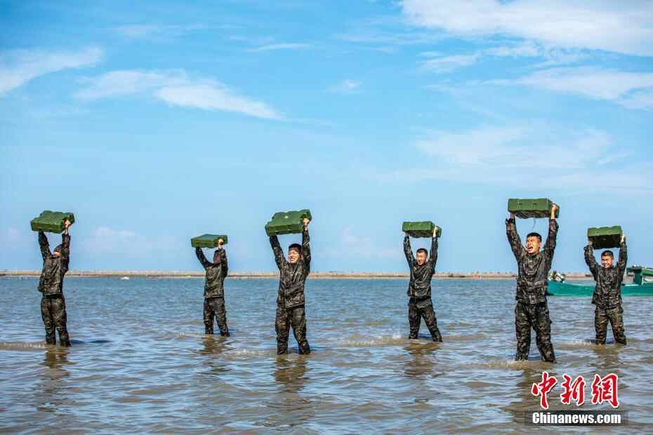 图为武警官兵在海水中进行负重训练。