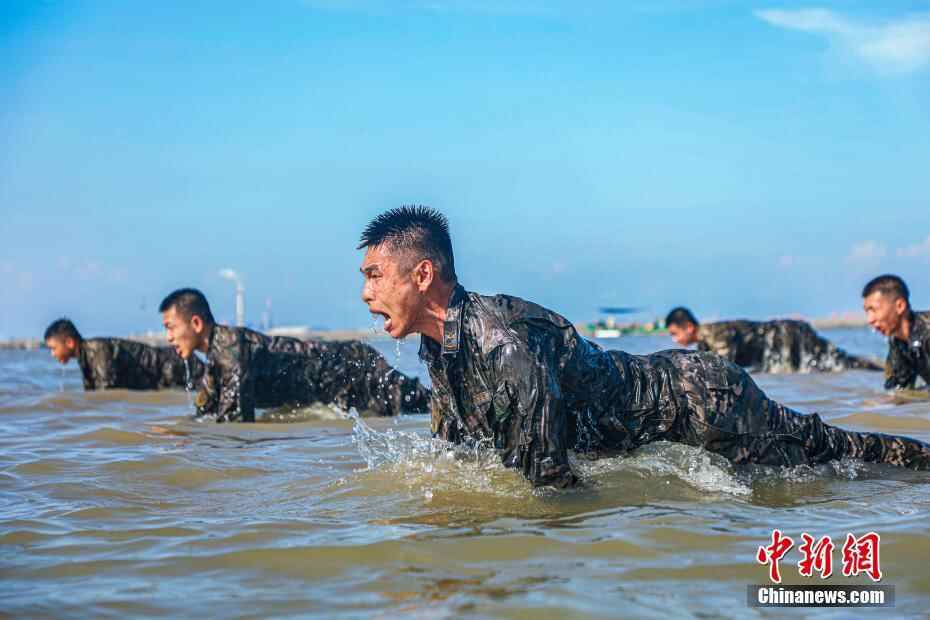 近日,武警广西总队防城港支队组织官兵在浅海区域开展擒敌对抗、实战搏击、综合体能等课目的强化训练,官兵们借此时机加强海上适应性训练,提高在高温、高湿、高盐环境的适应能力,为今后遂行各项任务奠定基础。图为武警官兵在海水中进行实战搏击训练。