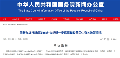 据国新网发布,国务院新闻办公室将于2025年6月10日(星期二)上午10时举行新闻发布会,请国家发展改革委副秘书长肖渭明和教育部、民政部、财政部、人力资源社会保障部、国家卫生健康委有关负责人介绍进一步保障和改善民生有关政策情况,并答记者问。