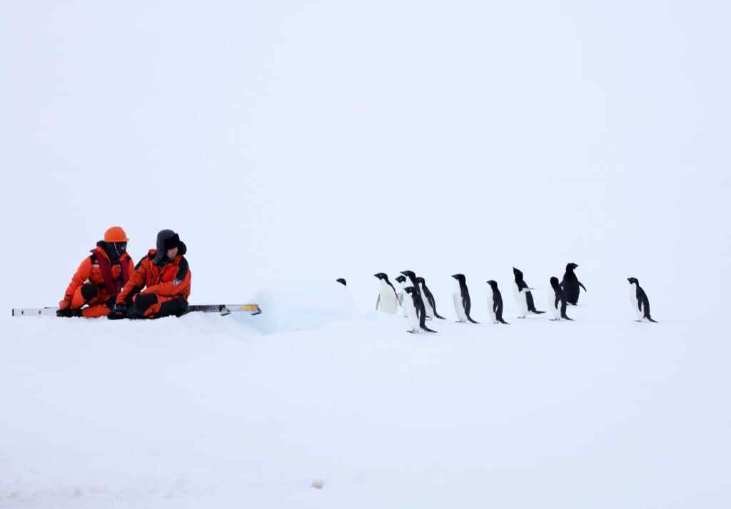 2024年12月27日,小企鹅遥望“雪龙2”号。新华社记者 黄韬铭 摄
