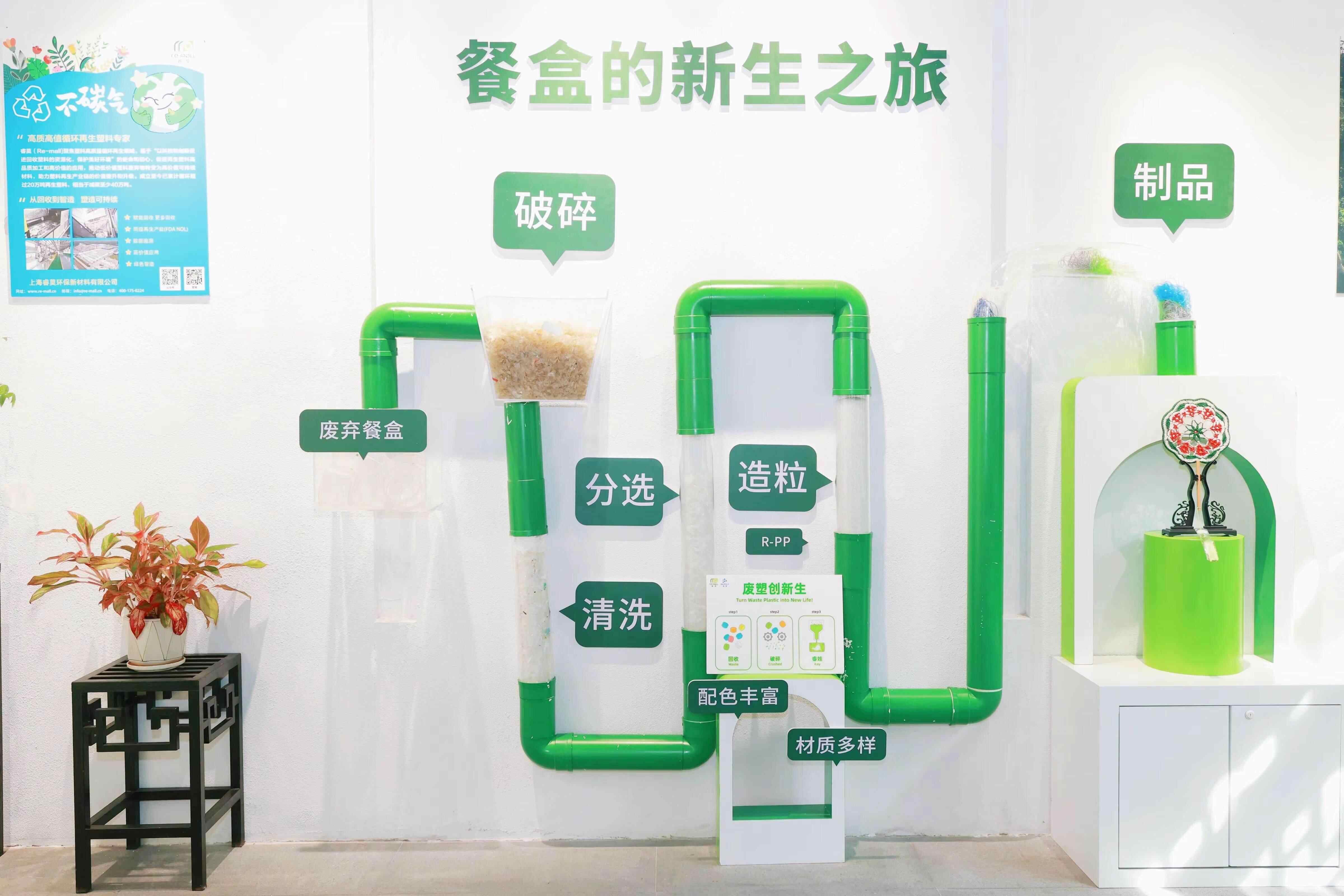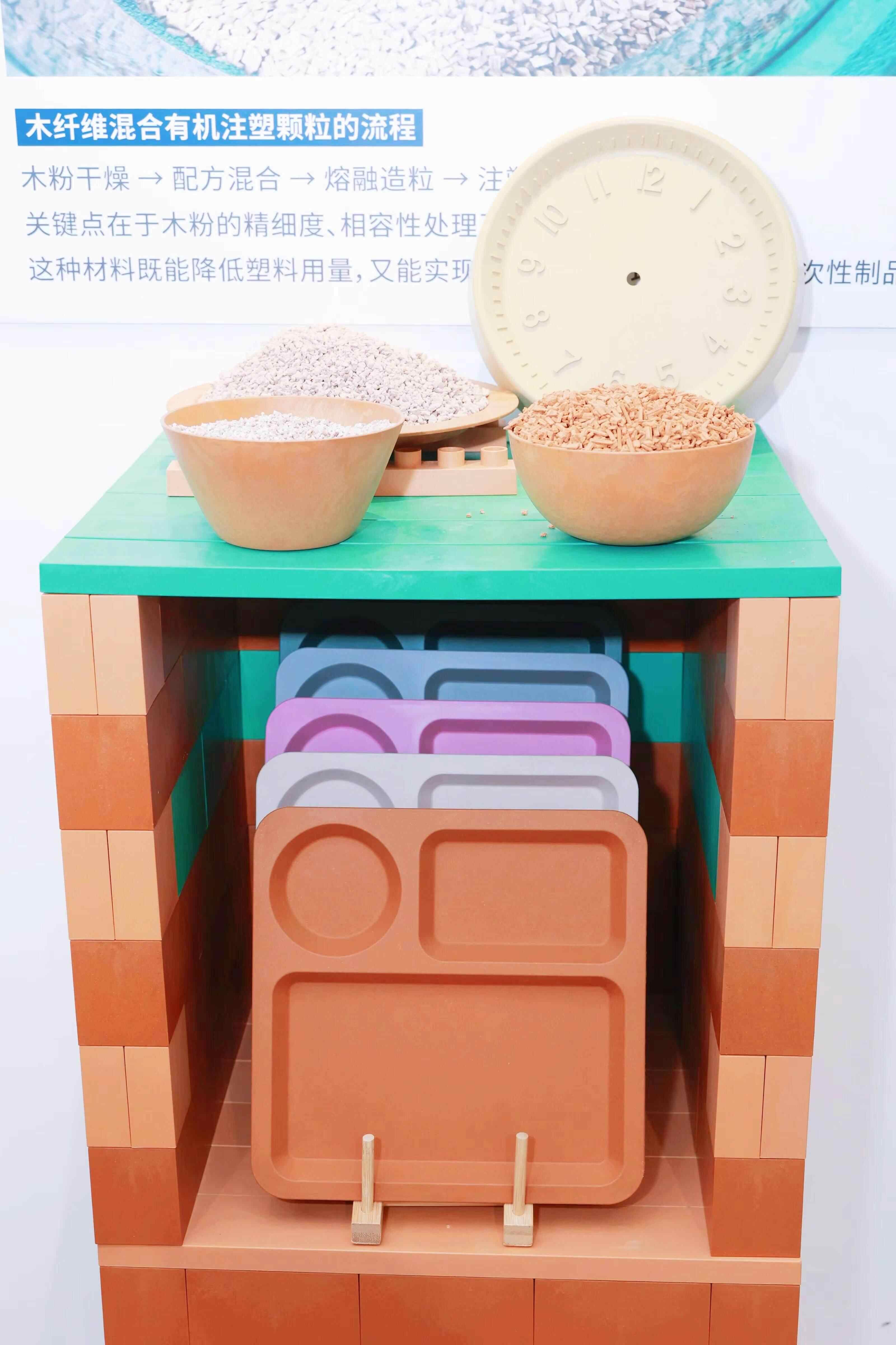 南展厅的塑料循环再生部分,展现了塑料餐盒从统一回收到分拣中心、经AI智能分选、清洗造粒后,转化为日化包装、家居用品等再生产品的过程。北展厅展示塑料替代,展示了树枝落叶等园林废弃物经破碎研磨等工序后制成木粉,与有机物混合高温注塑成型,制造各种生活用品的技术路径。