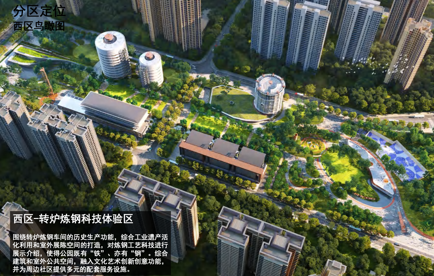 西区“转炉炼钢科技体验区”围绕转炉炼钢车间的历史生产功能,综合工业遗产活化利用和室外展陈空间的打造,对炼钢工艺科技进行展示介绍。综合建筑和室外公共空间,融入文化艺术创新创意功能,为周边社区提供多元的配套服务设施。