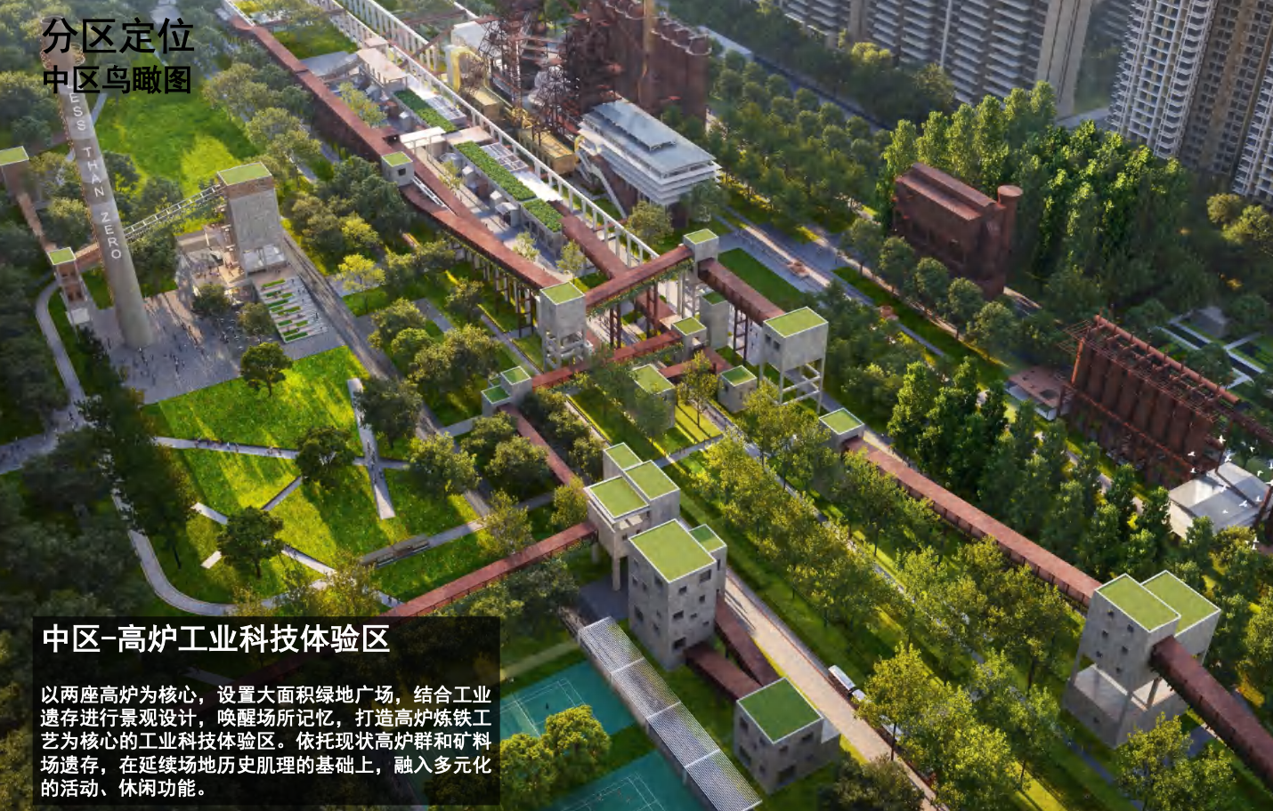 中区“高炉工业科技体验区”以两座高炉为核心,设置大面积绿地广场,结合工业遗存进行景观设计,打造高炉炼铁工艺为核心的工业科技体验区。依托现状高炉群和矿料场遗存,融入多元化的活动、休闲功能。