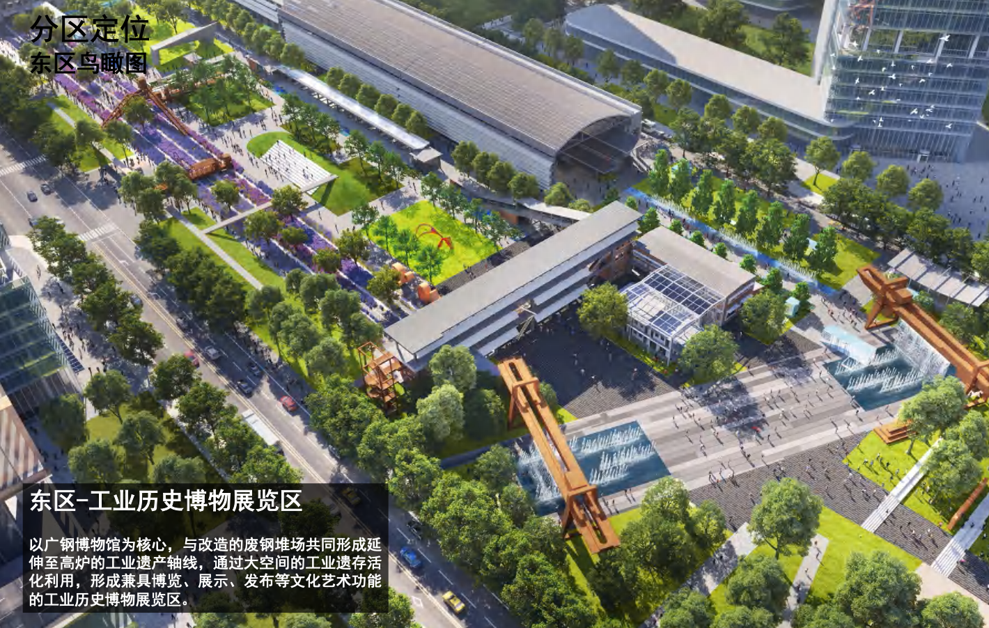 根据《征求意见稿》的总体设计,广钢公园的东、中、西区均有不同定位。东区“工业历史博物展览区”以广钢博物馆为核心,与改造的废钢堆场共同形成延伸至高炉的工业遗产轴线,通过大空间的工业遗存活化利用,形成兼具博览、展示、发布等文化艺术功能的工业历史博物展览区。