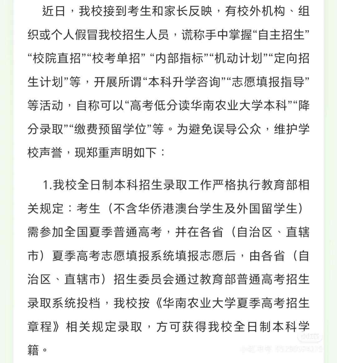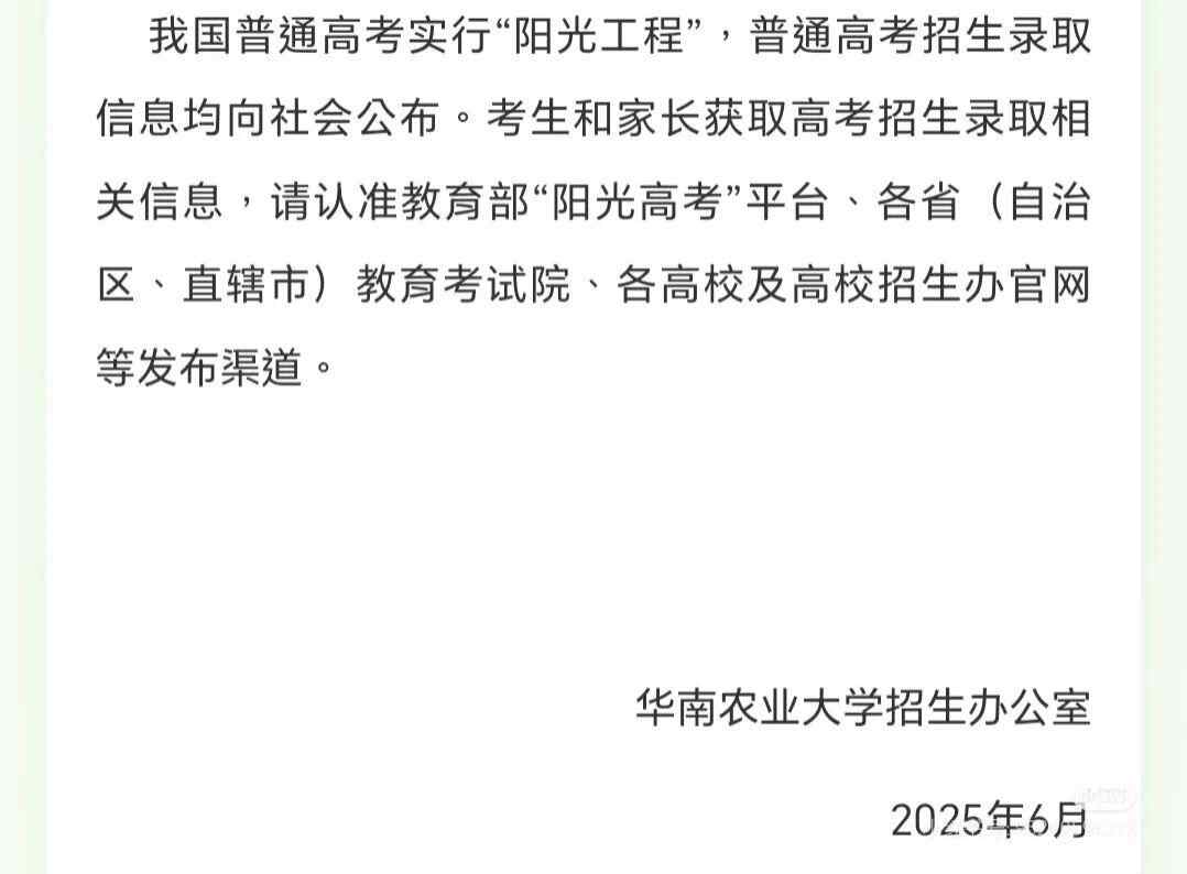 6月9日晚,华南农业大学发布《关于华南农业大学全日制本科招生录取的郑重声明》: