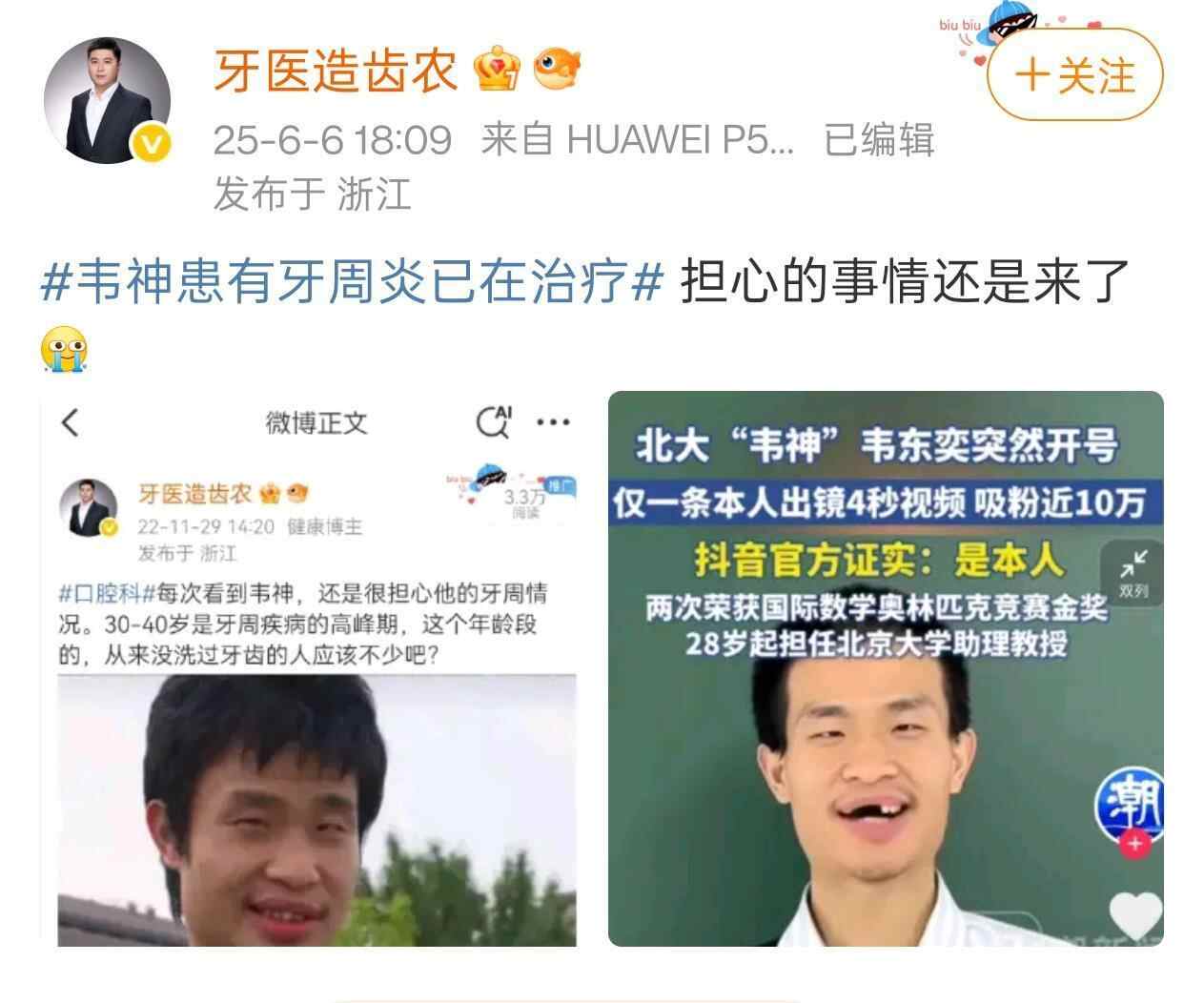 记者注意到,早在2022年11月,一位名叫牙医造齿农的医学博主就发帖称,“每次看到韦神,还是很担心他的牙周情况。30-40岁是牙周疾病的高峰期,这个年龄段的,从来没洗过牙齿的人应该不少吧?”