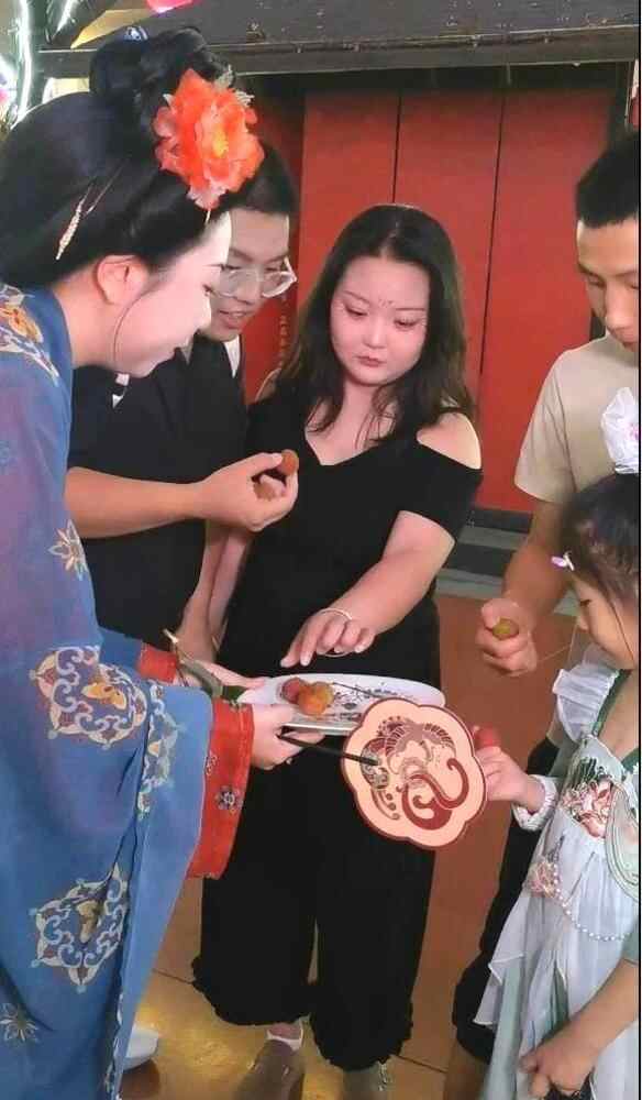 活动的文化体验从会客厅延伸至西安地标大唐不夜城。夜幕降临,荔枝化身为文化信使,在盛唐气象与现代繁华间架起桥梁。开元广场上,身着华美“凤凰衔绶”汉服的“唐美人”驿使,向游人递送装有岭南鲜甜荔枝与温泉体验券的精美礼盒,传递穿越时空的情谊。贞观之治雕塑群前,“穿汉服·品从化鲜荔”的互动邀约吸引众多游客驻足参与。汉服店内的荔枝纹饰拓印体验区人头攒动,参与者亲手拓印荔枝图案,换取鲜果或丝绸书签,岭南风物之美在互动中悄然浸润人心。