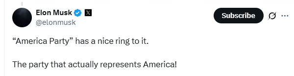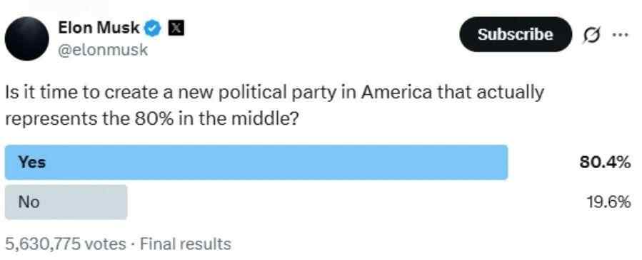 据了解,马斯克于5日首次提出这一想法。他在社交平台上向2.2亿粉丝发起投票,询问是否同意“是时候在美国创建一个真正代表80%中间派的新政党了”。