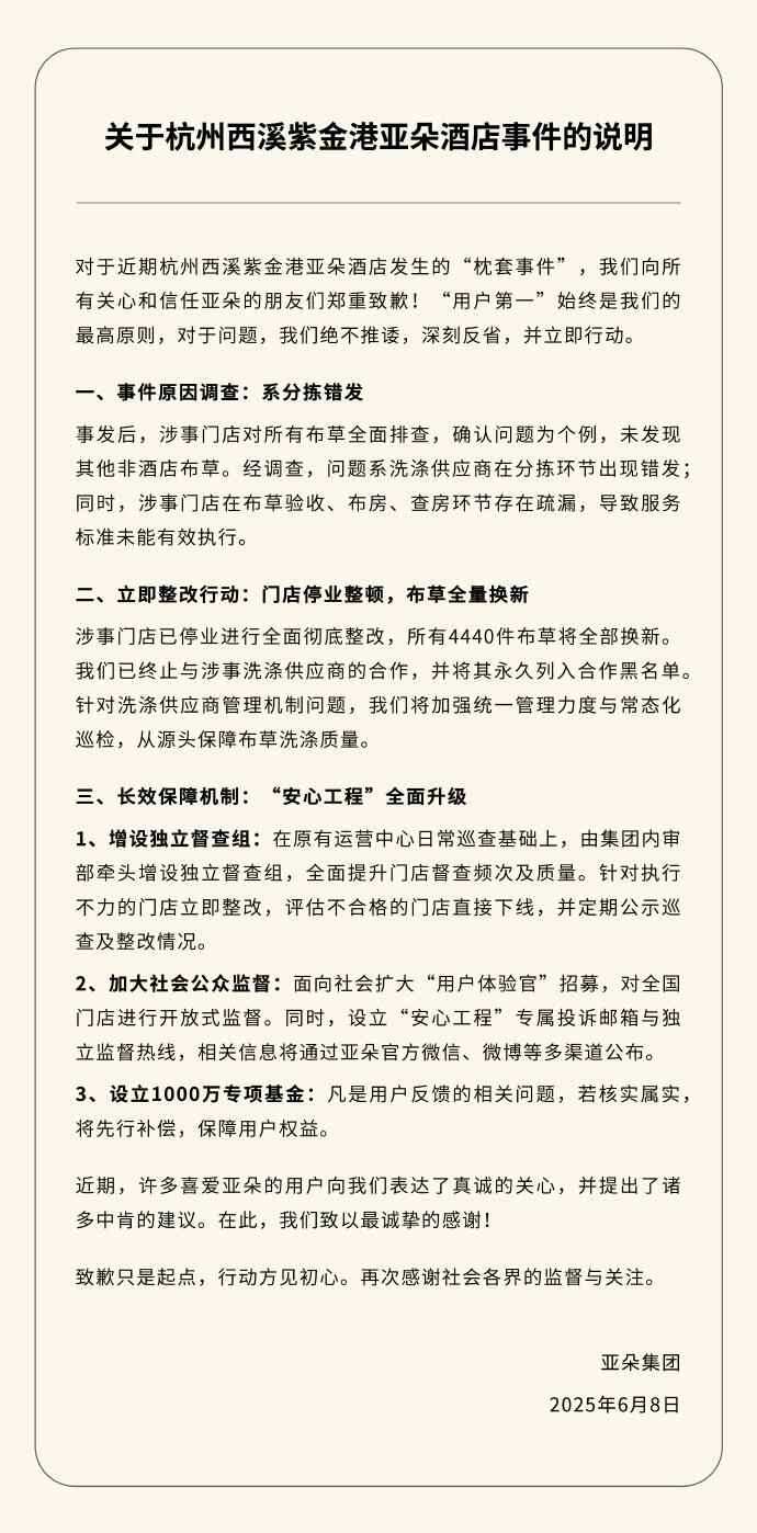 其中提到,经查,系洗涤供应商在分拣环节出现错发,亚朵集团已终止与涉事洗涤供应商的合作。以下为全文: