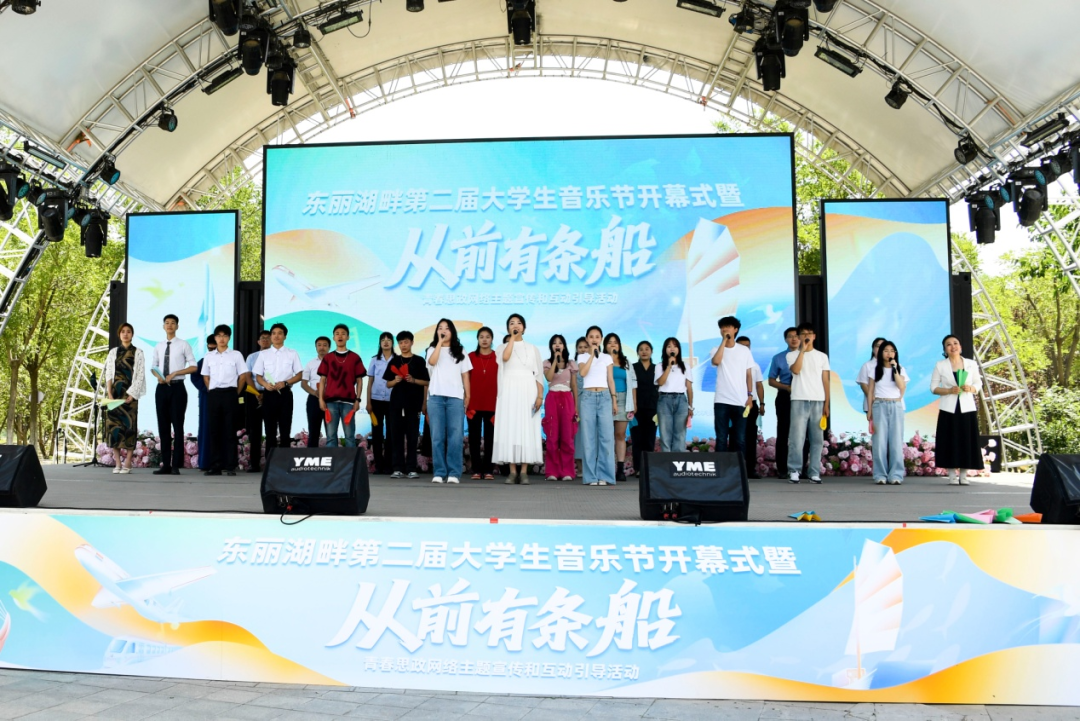 央广网天津6月8日消息(记者张强)东丽湖畔碧波荡漾,青春旋律与思想激荡同频共振。日前,由天津市东丽区委宣传部、东丽区委网信办联合主办的东丽湖畔第二届大学生音乐节开幕式暨“从前有条船”青春思政网络主题宣传和互动引导活动正式启幕。活动以“船”为叙事纽带,通过四大篇章串联百年红色基因与青春奋进力量,融合音乐艺术、红色话剧、数据可视化展演等创新形式,在青春奋进的旋律中探索新时代思政教育的“东丽答卷”。