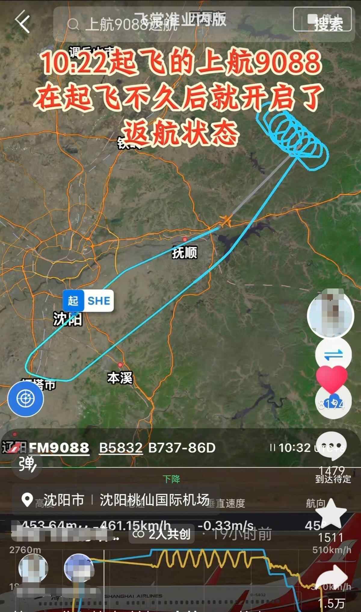 6月7日,有网友发视频称,上海航空的FM9088航班,当天上午10时20分左右从沈阳桃仙机场起飞,不久后开启返航状态,在空中绕圈飞行约8圈后,于11时45分左右再次降落到沈阳桃仙机场,引发网友关注。