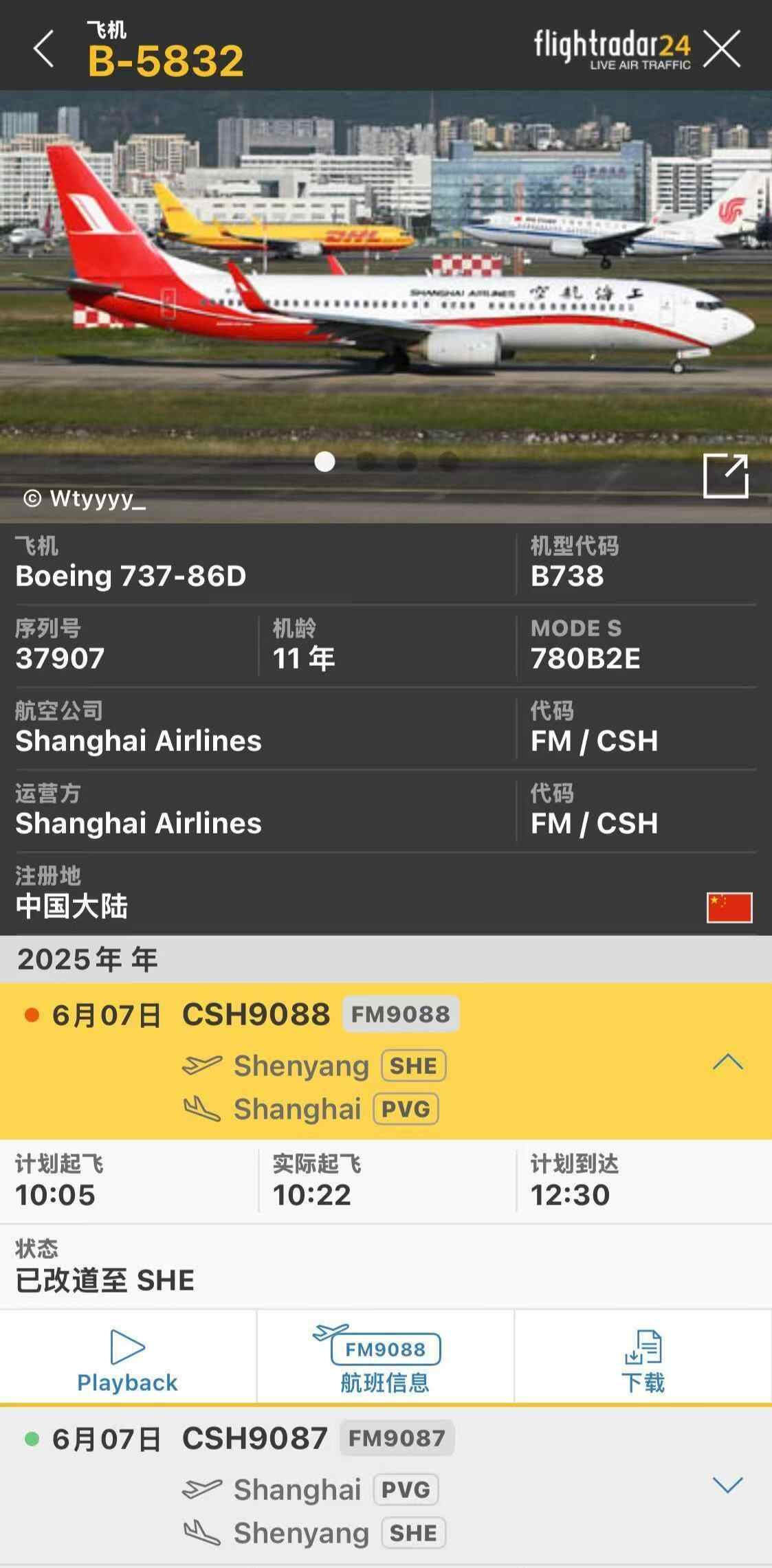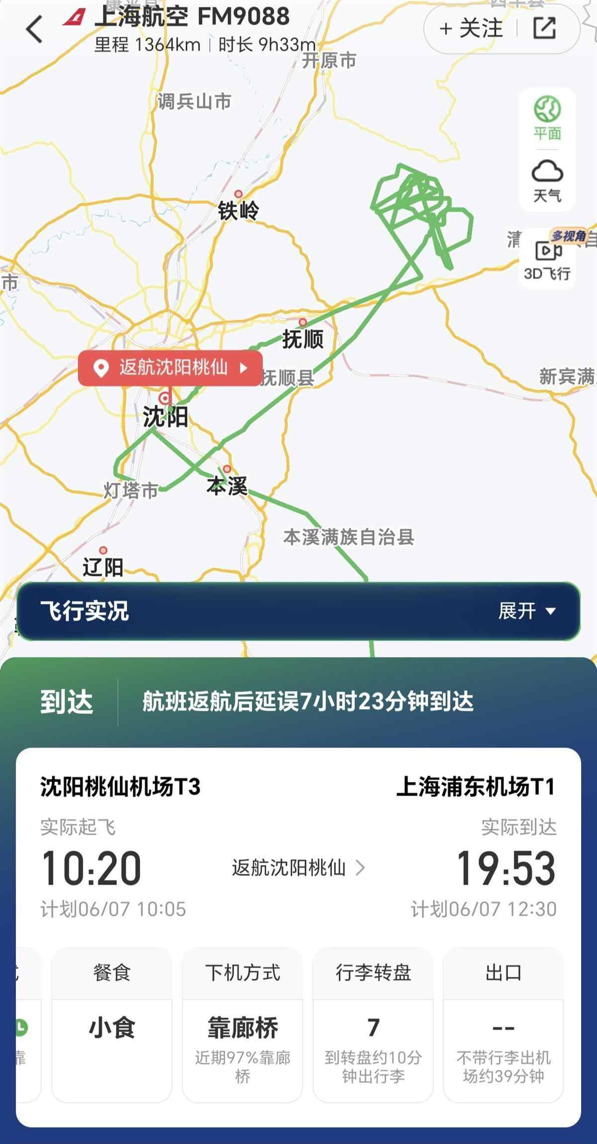 记者查询航旅纵横发现,FM9088航班于6月7日10时20分起飞后,没有向上海方向飞行,而是飞往沈阳市东北方的黄旗寨镇,并在其上方多次盘旋,约1个多小时后返航沈阳桃仙机场。