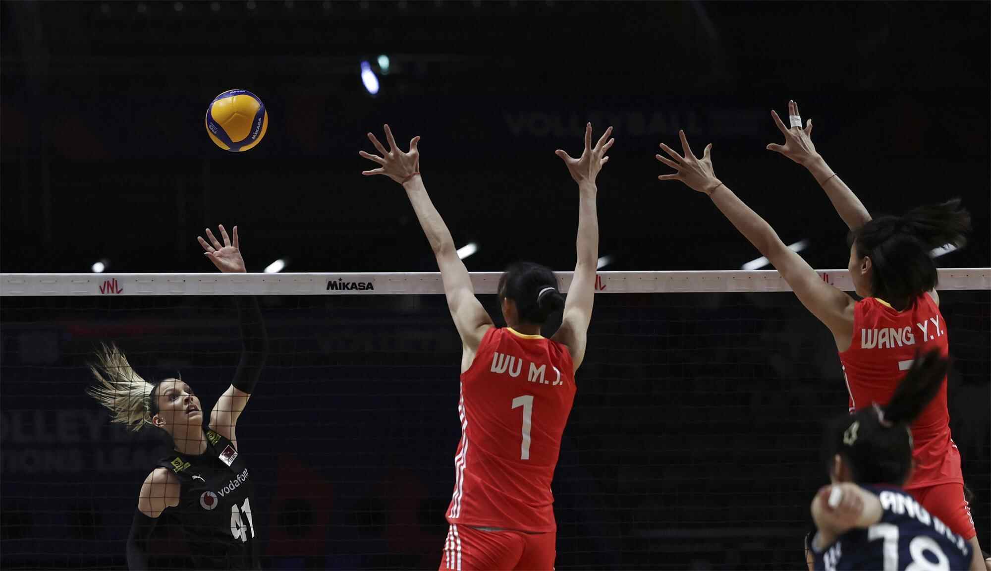 第三局前半局吴梦洁这点依然未能打开,一传也不稳,尤其二点攻时被卡5分,靠替补上场的19岁小将董禹含下球过轮,中国队中局一度落后8分。但其后中国队上演热血大逆转。先是吴梦洁后攻打开,王媛媛的拦网,庄宇珊的扣球接连得分,中国队将比分顽强追至24平。