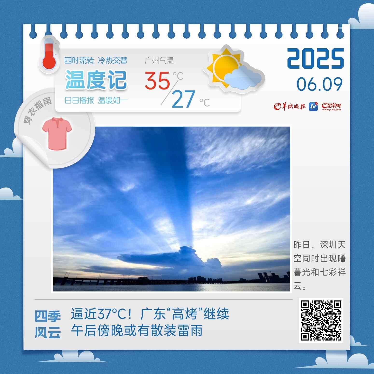 广州方面,这两天高温炎热,体感温度会比实际气温还要高。午后会有随机播撒的局地雷雨,运气不好的可能会碰上,出门建议带一把晴雨两用伞,注意防暑防晒,多多喝水!