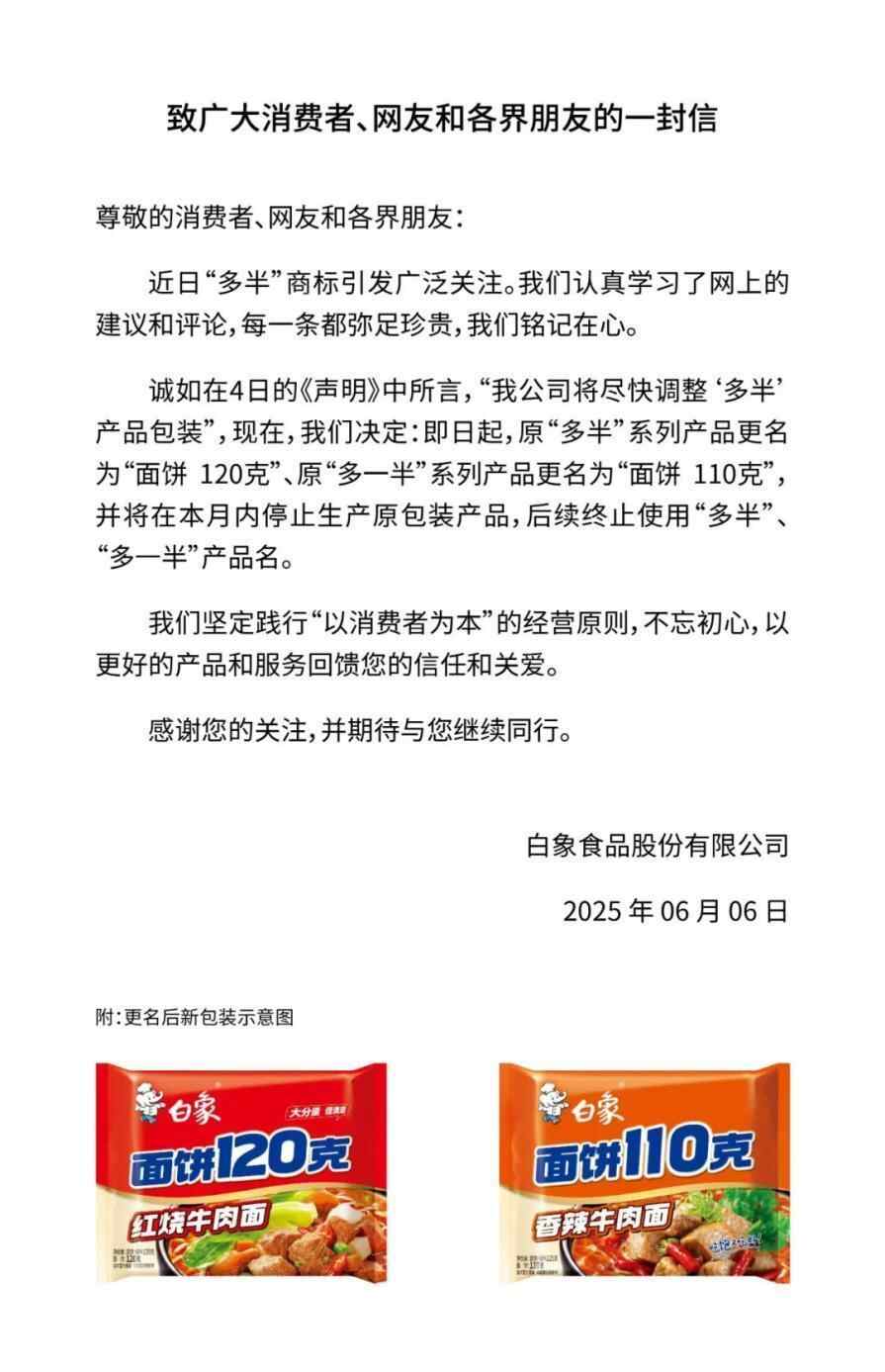 所幸的是,两家品牌方都放下了身段,一个说停止再使用相关商标,一个作出了各种赔偿承诺以及推出各种监管措施。这当然是好事。以白象为例,他们说“多半”系列此后改名为“面饼120克”。这多好,面饼就是面饼,它不会变成银鳕鱼或佛跳墙,落落大方地以面饼的面目示人,这才是一块有自信、有担当的面饼。这让人心里多踏实。