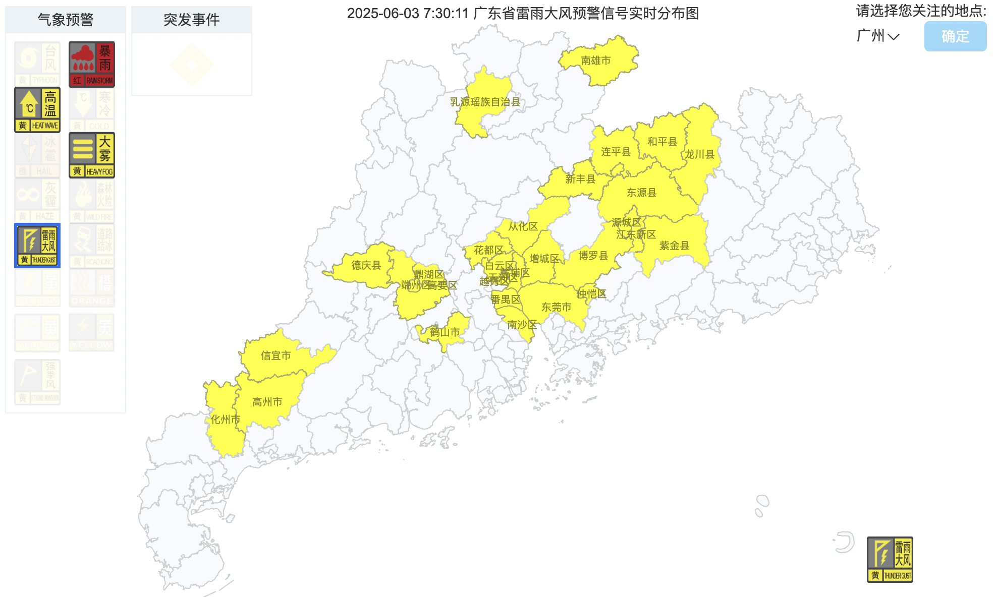 根据广东天气网数据,截至3日7时30分,云浮郁南,肇庆鼎湖、端州、德庆、高要、四会,惠州博罗、龙门,河源东源等县市区,维持发布暴雨红色预警信号;茂名、清远、广州、韶关、梅州、潮州等市,有最高暴雨预警至橙色的县市区;江门、佛山、东莞,有最高暴雨预警至黄色的县市区;茂名、肇庆、江门、广州、韶关、东莞、惠州、河源等市,有最高雷雨大风预警至黄色的县市区。