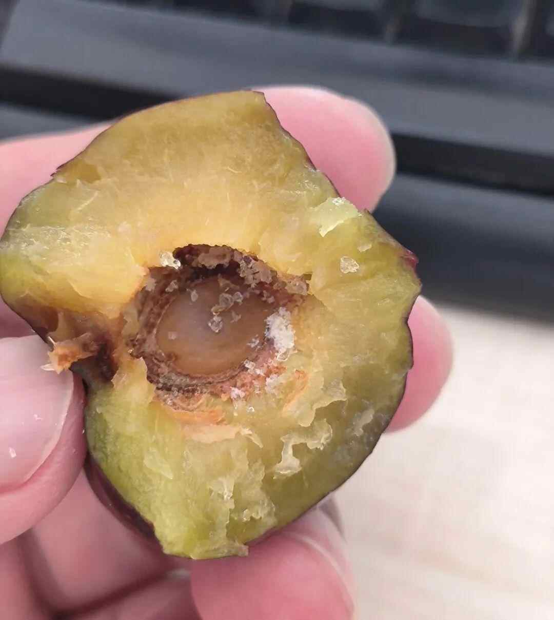 当李子内部出现核裂后,果肉会自动愈合,偶尔会产生一些果胶——这些白色晶体。这种情况也会发生在桃子上。