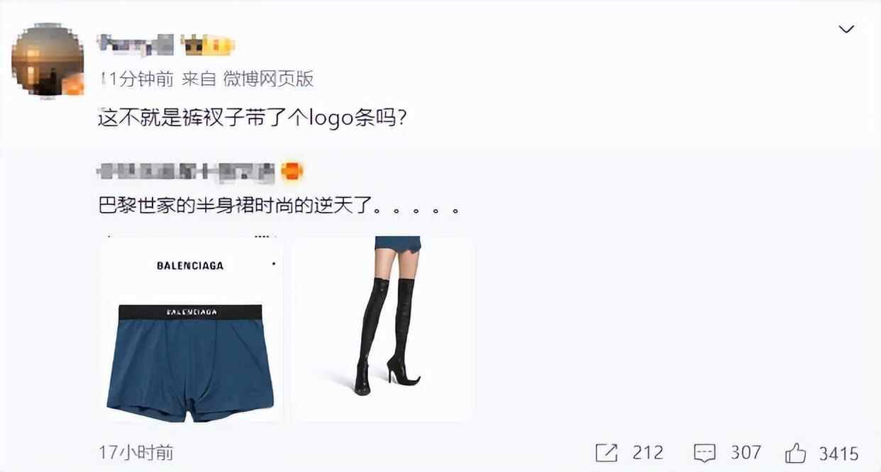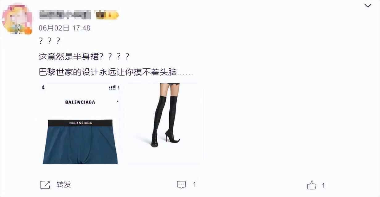 该设计也引发网友吐槽,“巴黎世家的设计永远让你摸不着头脑”“时尚得逆天了”“这不就是裤衩子带了个logo条吗”。