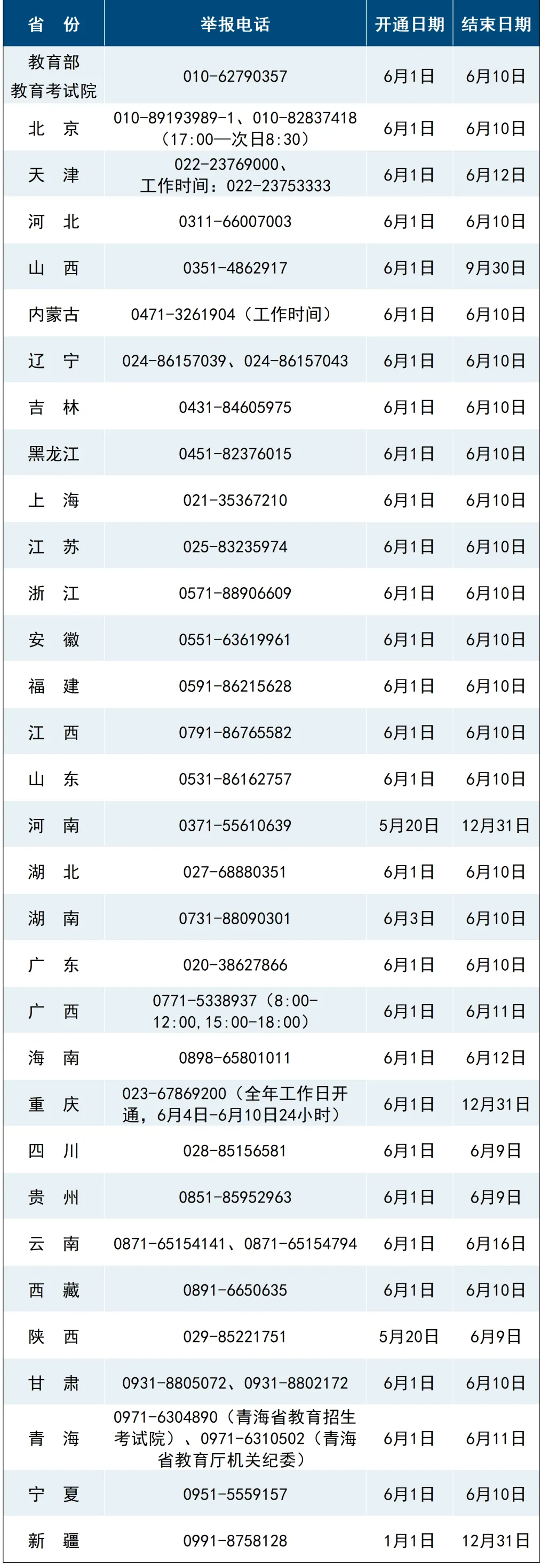 近日,教育部统一公布了教育部以及各省(区、市)2025年的高考举报电话,欢迎广大考生、家长及社会各界人士及时举报反映涉及2025年高考的问题线索。教育部及各省(区、市)将会同有关部门根据举报线索第一时间核查处理,坚决维护高考公平公正。