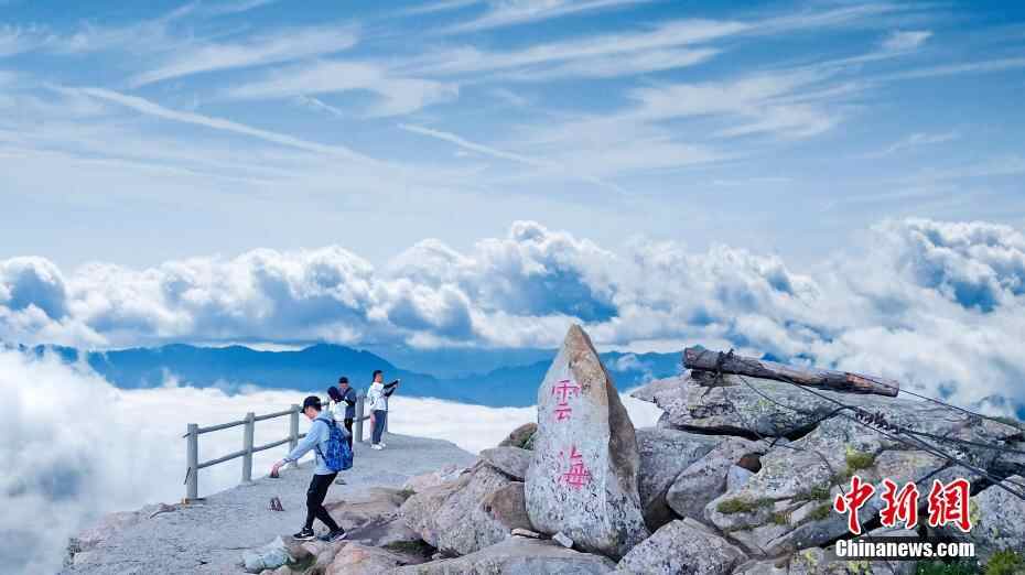 近日,位于秦岭腹地的西安朱雀国家森林公园内,绵延秦岭山脉与云海交相辉映,吸引了不少游客前来登山赏景,蔚为壮观。图为不少游人登山赏景。