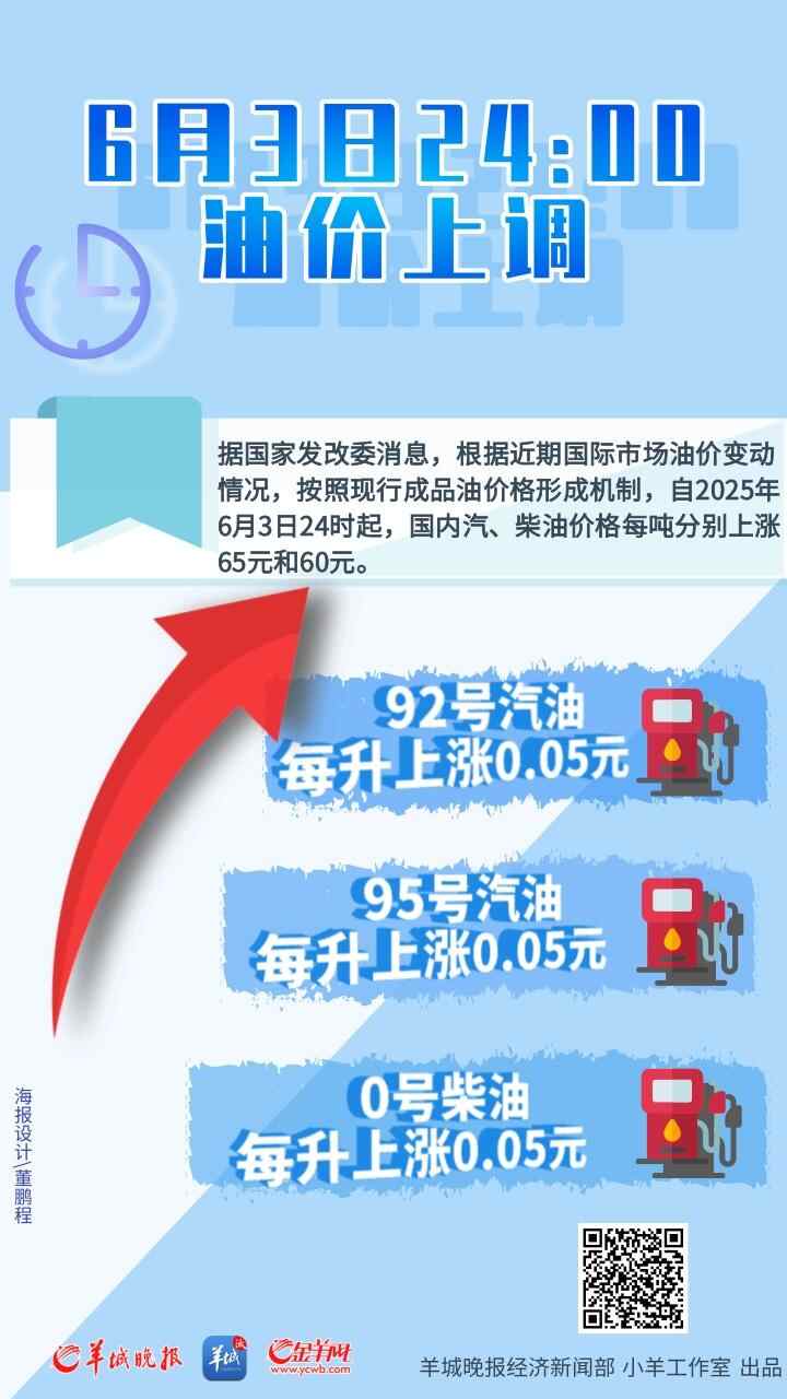 6月3日,羊城晚报记者从国家发改委官网获悉,根据近期国际市场油价变化情况,按照现行成品油价格形成机制,自2025年6月3日24时起,国内汽、柴油价格(标准品,下同)每吨分别上调65元、60元,折升价92#汽油、95#汽油、0#柴油均上调0.05元。