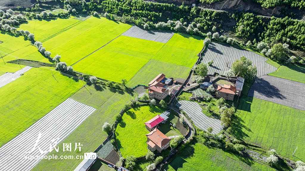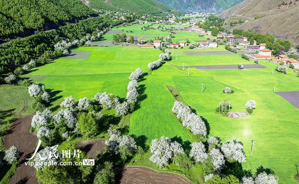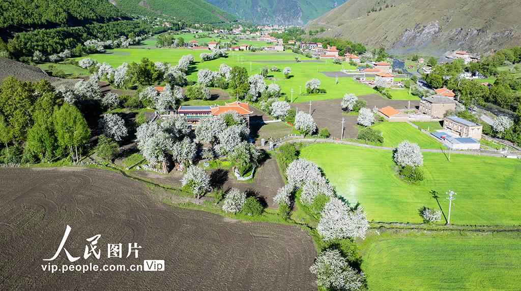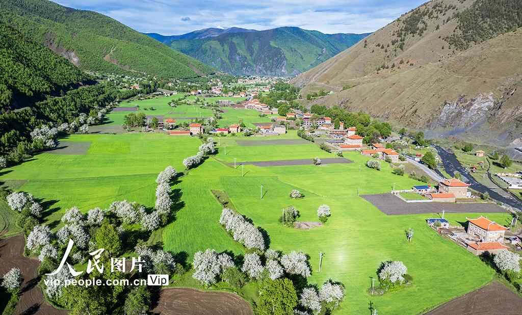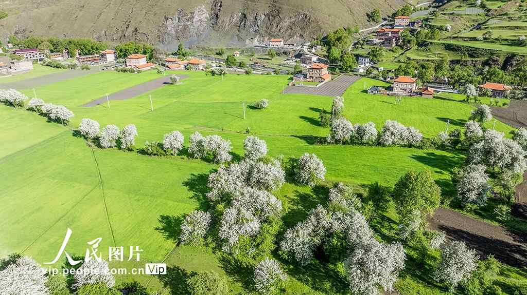 2025年6月2日,四川省甘孜藏族自治州康定市甲根坝镇昌木村,绿油油的青稞田与竞相绽放的贡嘎海棠花交织成景,构成一幅高原初夏的生态画卷,美不胜收。张佳豪摄(人民图片网)