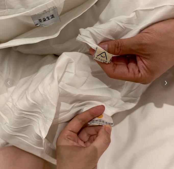 网友在发帖中称,6月2日,她们首日入住杭州西溪紫金港亚朵酒店,晚上就寝时意外发现床上的两个枕套一个自带亚朵标签,另一个的标签却显示来自杭州一家医院。记者搜索看到,该医院系一家大型民营医疗机构。