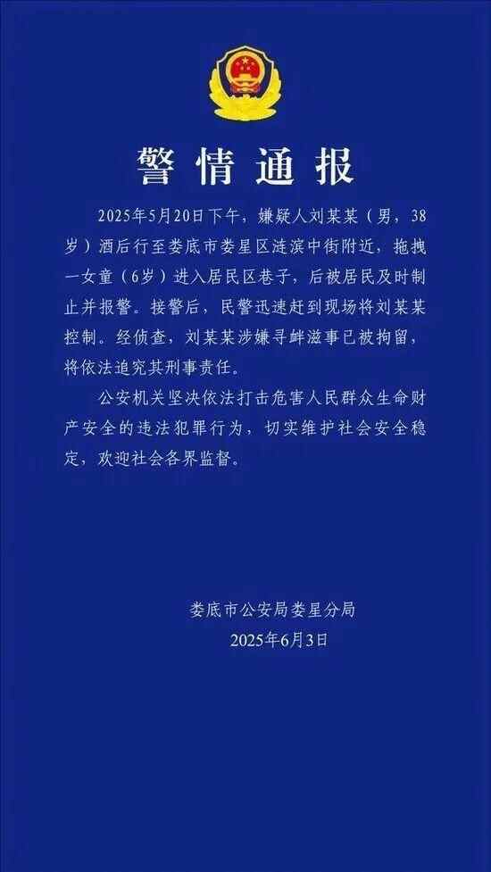 5月20日下午,嫌疑人刘某某(男,38岁)酒后行至娄底市娄星区涟滨中街附近,拖拽一女童(6岁)进入居民区巷子,后被居民及时制止并报警。
