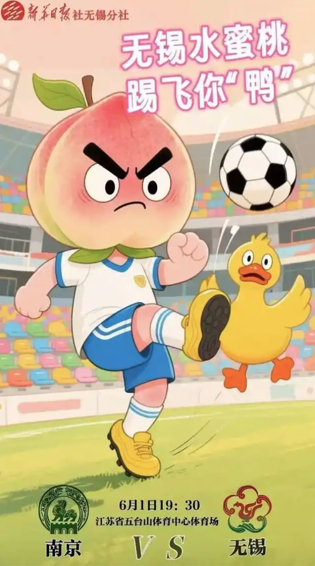盐水鸭VS水蜜桃:南京与无锡赛前海报上演“踏平花果山”与“全糖冲鸭”的互怼,网友调侃“输了水蜜桃加盐,赢了盐水鸭加糖”。