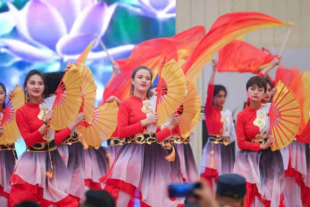 新疆艺术学院学生表演舞蹈《阳光下的麦盖提》(2023年3月20日摄)。新华社记者 胡虎虎 摄