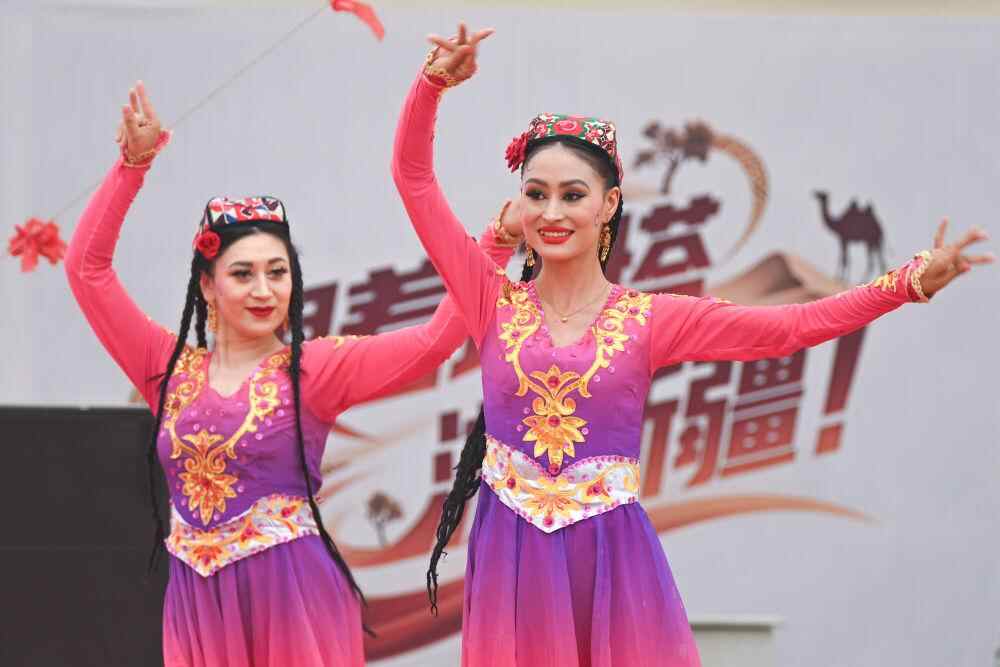 2025年5月30日,2025中国环塔国际拉力赛新疆喀什地区麦盖提赛段欢迎晚会上的歌舞表演。新华社发(环塔组委会供图)