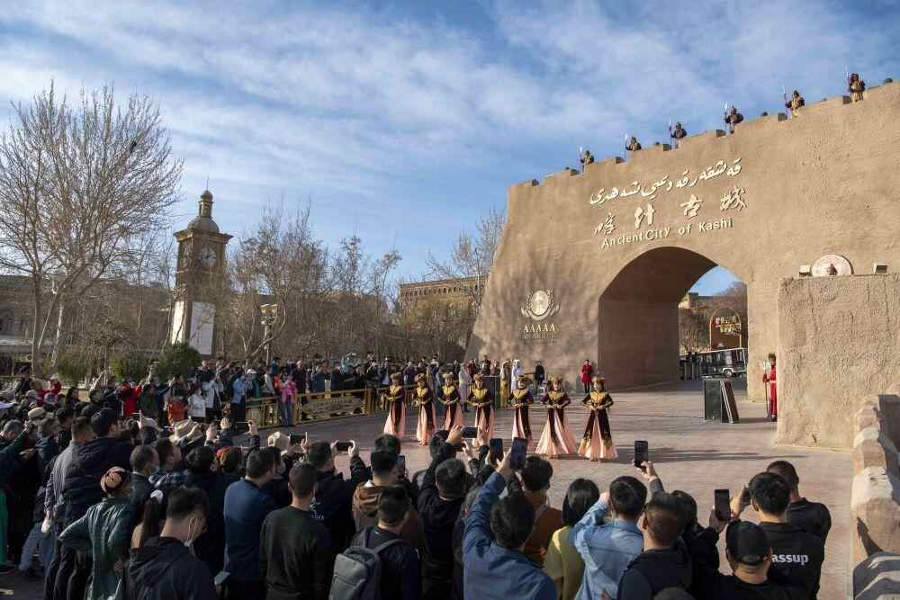 游客在新疆喀什古城景区东大门观看“开城仪式”(2023年3月10日摄)。新华社记者 胡虎虎 摄