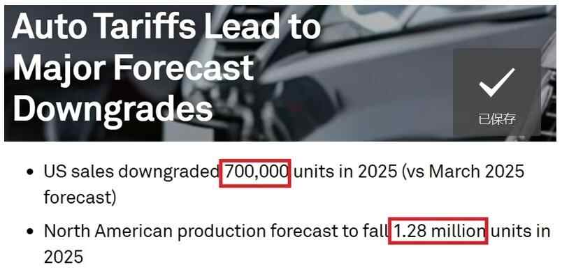 标普全球汽车的一份报告显示,如果美国持续对进口汽车加征高额关税,2025年美国汽车销量将减少约70万辆,北美地区的汽车产量也将减少128万辆。